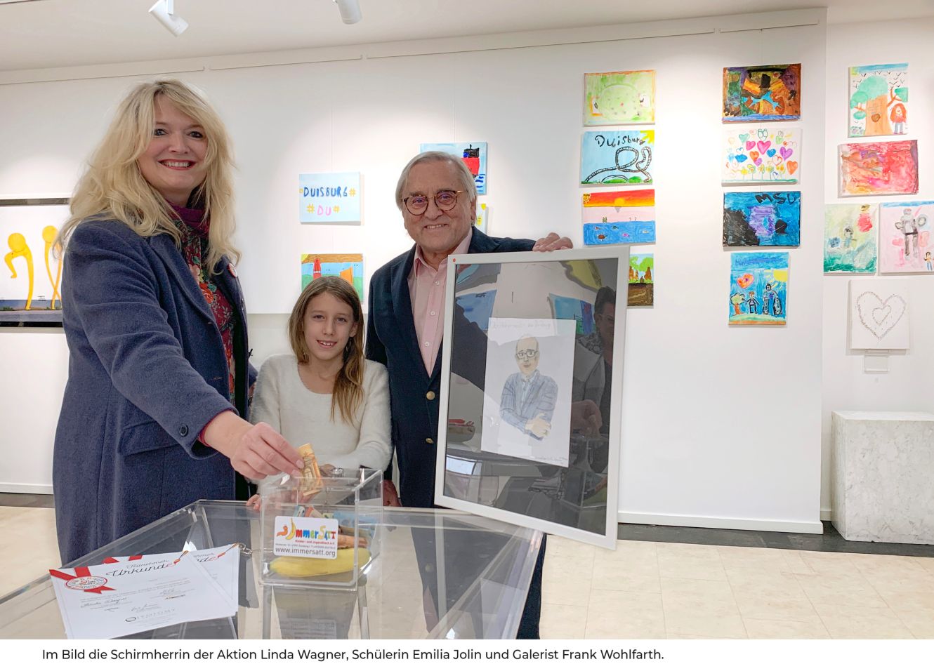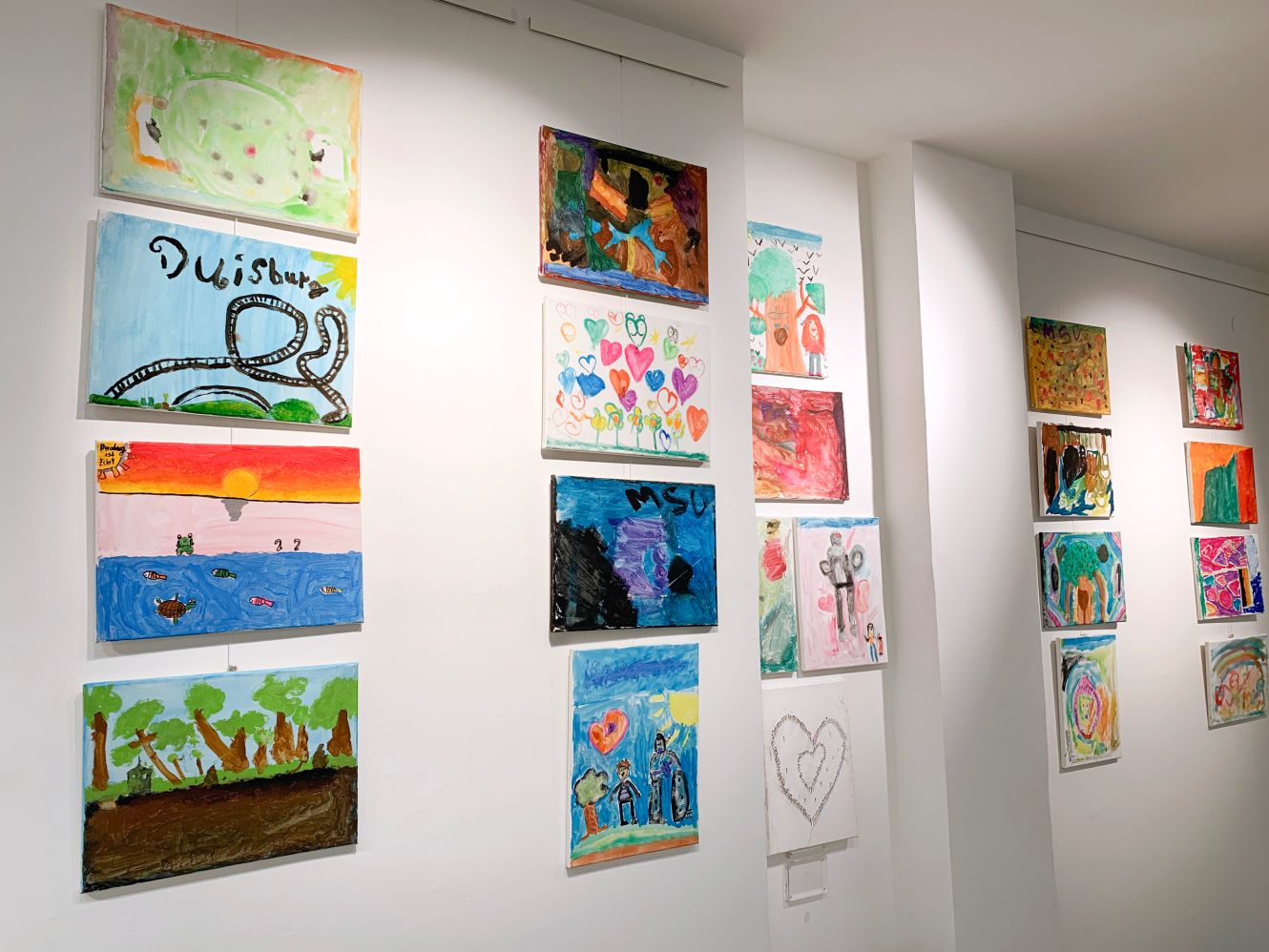 Die Ausstellung ist eröffnet. Die Eltern kommen mit ihren Kindern in die Yotomy Kunstgalerie in der Kuhstraße 8 in Duisburg, um ihre Kunstwerke in einer echten Ausstellung wieder zu finden. Alle Kinder haben von der Galerie Leinwände, Pinsel und Farben bekommen und stellen jetzt ihre Bilder für einen guten Zweck zur Verfügung: Die Erlöse aus dem Verkauf der Bilder geht an die Immsersatt Kinder- und Jugendtisch e.V., die jeden Tag ein gesundes Frühstück an die Schulen liefert (700 Frühstücke jeden Tag!)